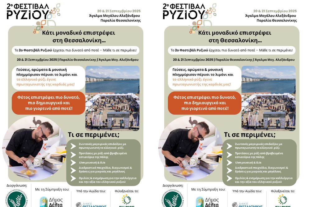 Το 2ο Φεστιβάλ Ρυζιού επιστρέφει στη Θεσσαλονίκη στις 20 & 21 Σεπτεμβρίου με γεύσεις, μουσική και εκπλήξεις για μικρούς και μεγάλους. Με πλήθος εκδηλώσεων και δράσεων, μεταξύ των οποίων, ζωντανές μαγειρικές επιδείξεις με «πρωταγωνιστή» το ελληνικό ρύζι, γευστικές προτάσεις με κύριο συστατικό το ρύζι από βραβευμένα εστιατόρια της Θεσσαλονίκης, διαδραστικα παιχνίδια και διαγωνισμούς για μικρούς και μεγάλους, αλλά και ομιλίες και ενημέρωση για την καλλιέργεια και την αξία του ελληνικού ρυζιού.