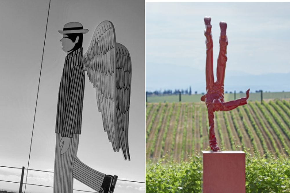 Έπειτα, βγαίνεις στον αμπελώνα, όπου ο χώρος λειτουργεί σαν υπαίθρια γκαλερί. Έργα Ελλήνων και ξένων καλλιτεχνών βρίσκονται ανάμεσα στα κλήματα και το ωραίο είναι ότι δεν ζητούν να τα «καταλάβεις»· σε αναγκάζουν απλώς να επιβραδύνεις, να σταθείς, να κοιτάξεις… Στο σύνολό τους αυτή τη στιγμή είναι περίπου 47. Ανάμεσα στα έργα που συναντάς είναι το «Ένα τσαμπί σταφύλι» του Κώστα Τσόκλη, το «Φεγγάρι» του Κώστα Βαρώτσου, το «Ερωτικό» του Γιάννη Μόραλη, το «Κυκλαδικό» του Γιώργου Ζογγολόπουλου, τον «Ισορροπιστή» του Γιώργου Λάππα, το «Malgré tout» του Renzogallo και το «Αιολικό Σινιάλο» του Takis – σαν μικρές παύσεις μέσα σε μια διαδρομή που τελικά σε προετοιμάζει και για την ίδια τη γεύση.